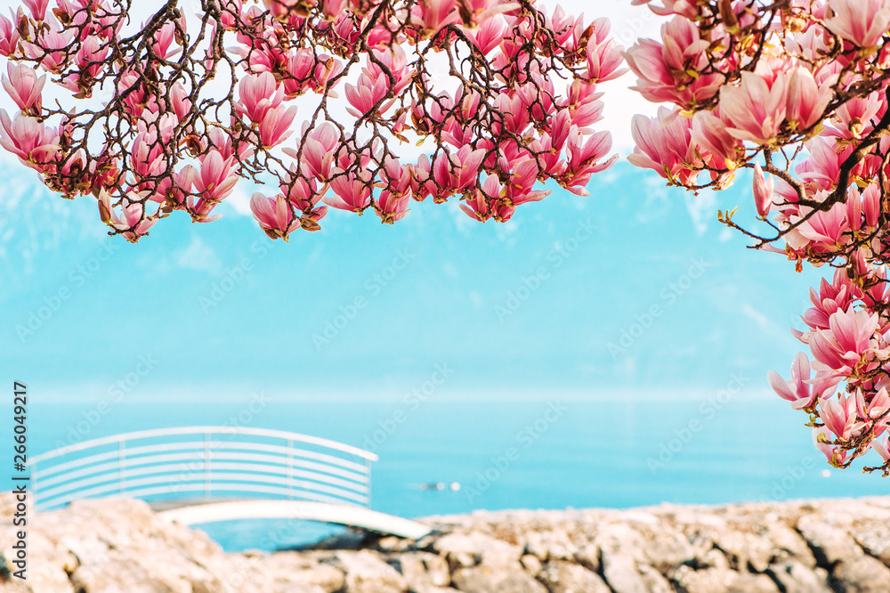 Amazing spring landscape of swiss Lake Geneva and blooming Magnolia flowers, image taken in Lausanne, Switzerland