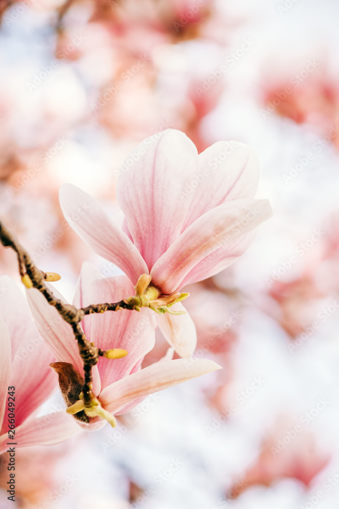 Nature background with pink magnolia flowers blossoming in spring