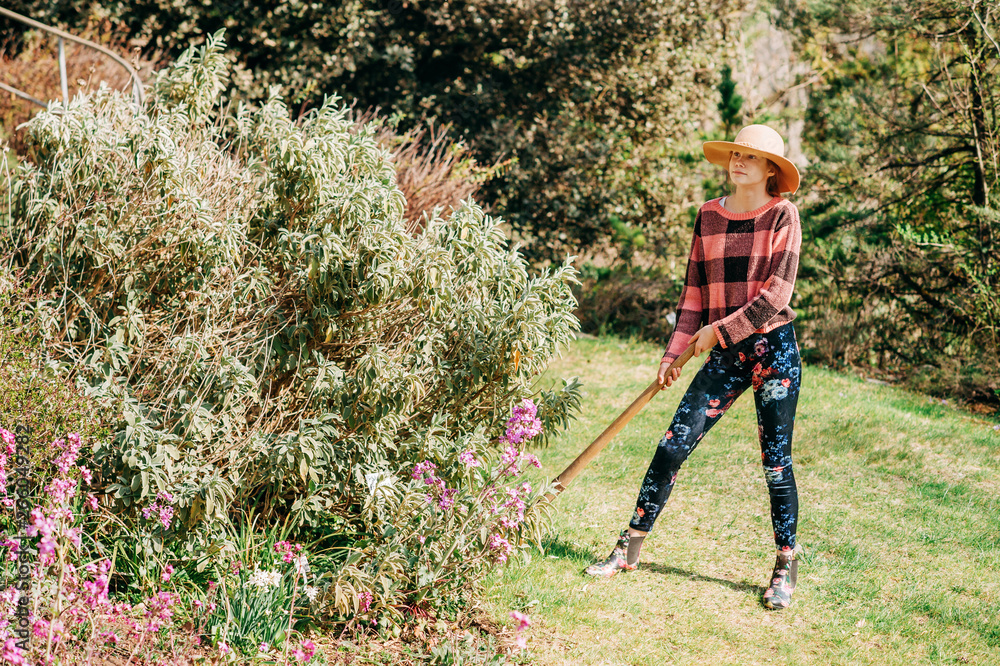 Outdoor portrait of young preteen kid girl helping in spring garden, holding a shovel, wearing a hat and fashionable rain boots