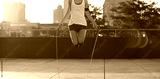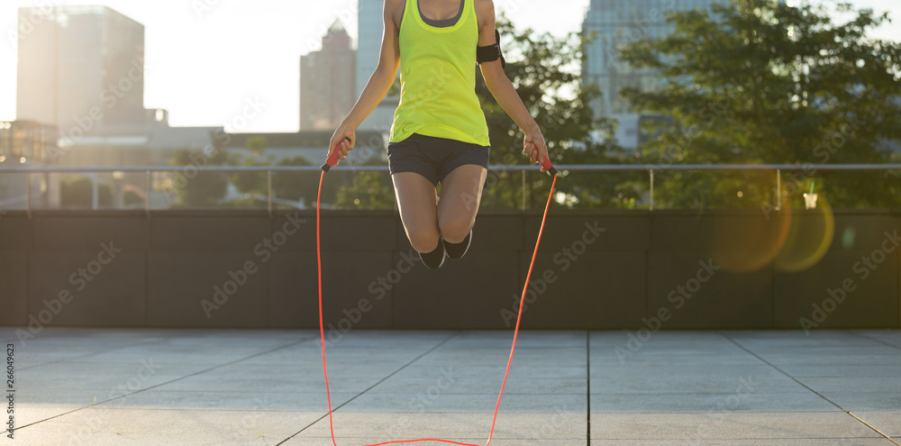 young fitness woman jumping rope on city
