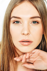 Close up portrait of beautiful young woman with blond hair and nude make up