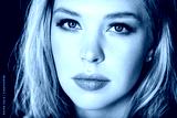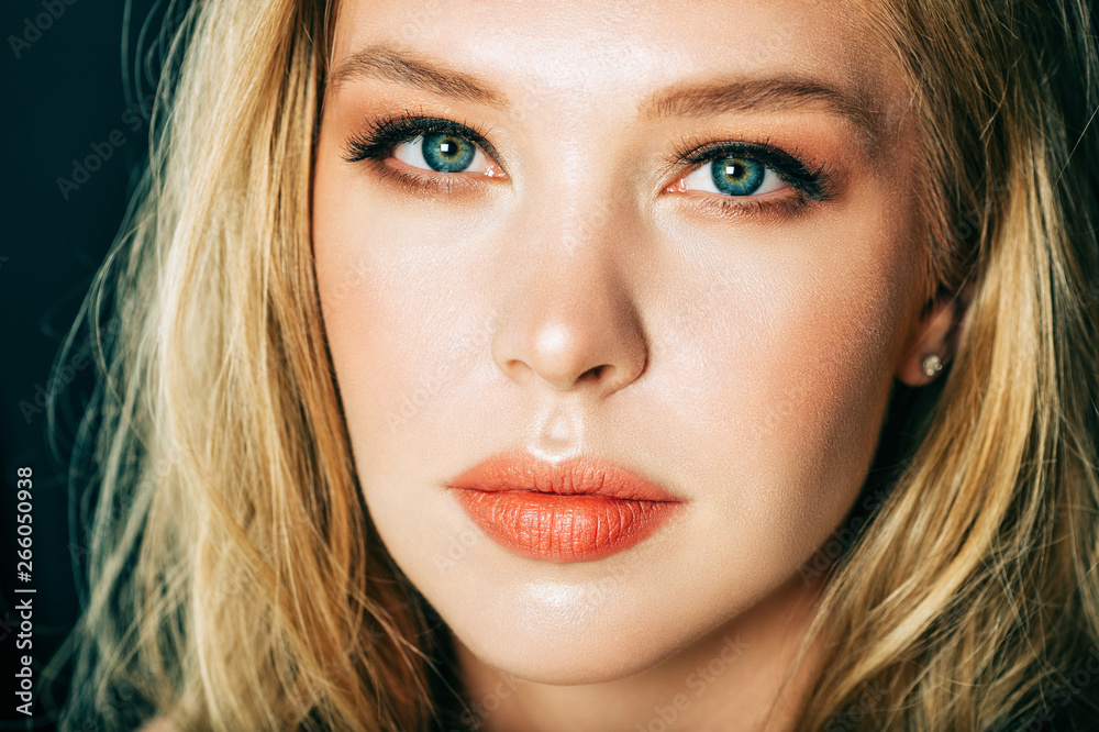 Close up portrait of beautiful young woman with blond hair and professional make upm posing on black background