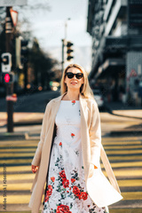 Outdoor fashion portrait of beautiful woman with blond hair, wearing white fashionable dress and beige coat, crossing road