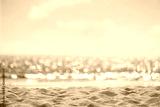 Seascape abstract beach background. blur bokeh light of calm sea and sky. Focus on sand foreground.