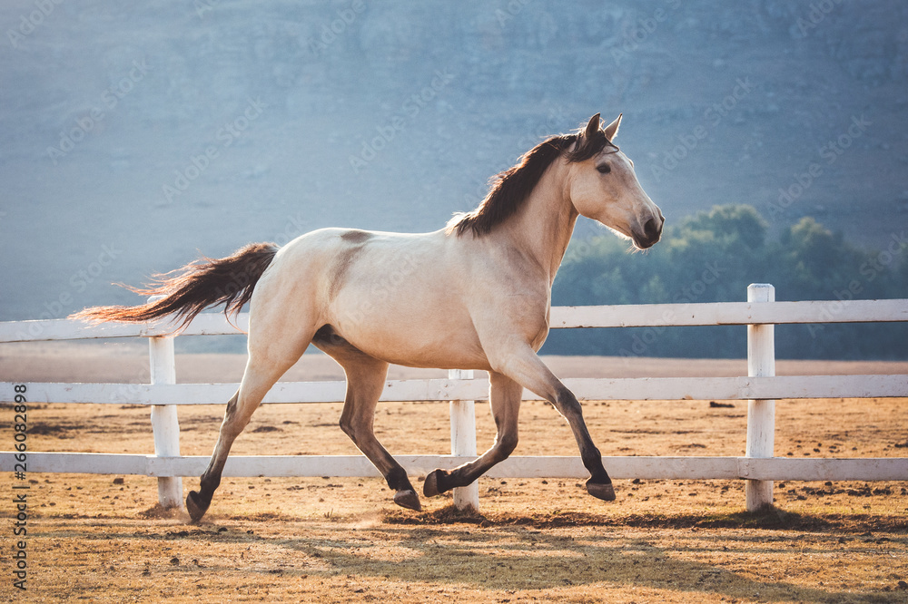 Buckskin mare running in a South African landscape