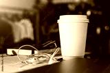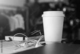 Closeup of a white paper cup of coffee on a table in an empty cafe without people. Nearby are the headphones and notebook. Mockup.