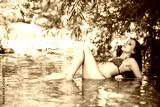 Young beautiful young woman in bikini with green eyes lying in the clear river water in summer time. Concept Wellness, Advertising