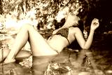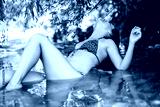 Young beautiful young woman in bikini with green eyes lying in the clear river water in summer time. Concept Wellness, Advertising