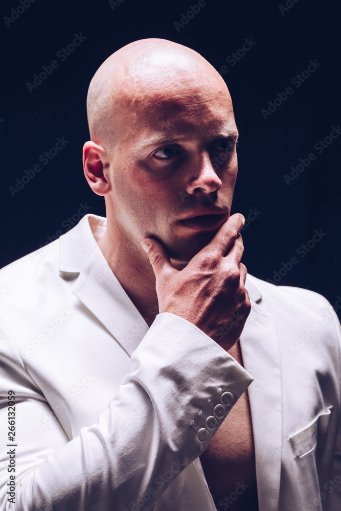 Elegant muscular attractive young man with white smart jacket open on naked torso. Fitness male bodybuilder posing.