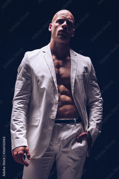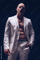 Elegant muscular attractive young man with white smart jacket open on naked torso. Fitness male bodybuilder posing.