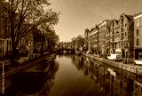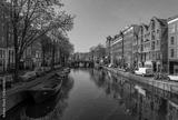 Outdoor sunny view of typical Holland brick architectures, boats and street along beautiful shady canal at red light district in spring season in the morning.