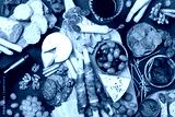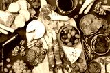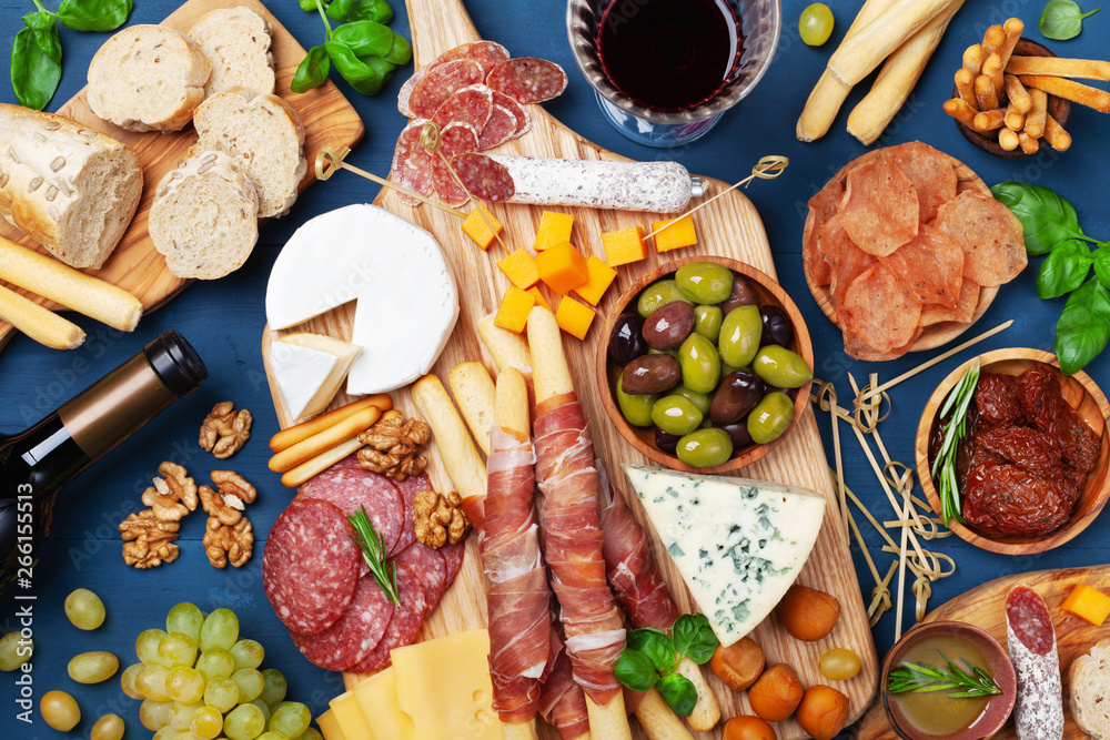 Italian appetizers or antipasto set with gourmet food on kitchen table top view. Mixed delicatessen of cheese and meat snacks with red wine.