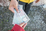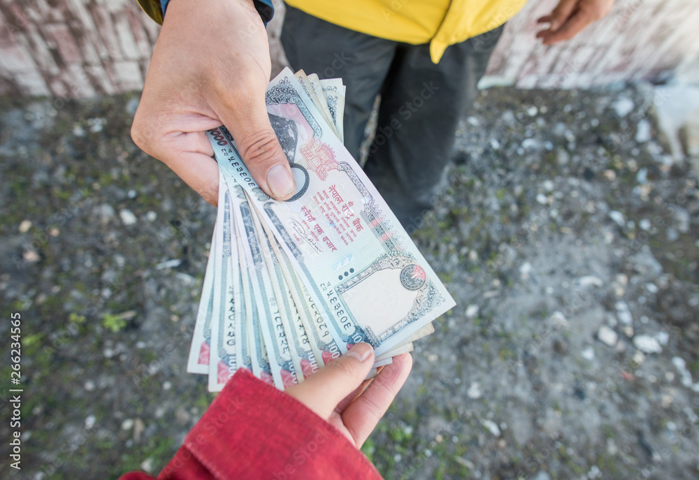 Close up of someone hands giving a pile of Nepalese money to each others. Nepal currency banknotes.