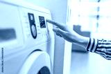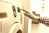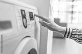 Housewife using display and button for turning on and choosing cycle program on washing machine for laundry at home.