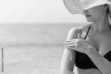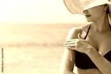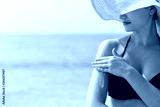 Sunscreen sunblock. Woman in a hat putting solar cream on shoulder outdoors under sunshine on beautiful summer day