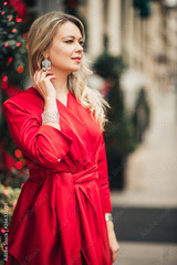 Christmas portrait of beautiful woman with blond hair, wearing red dress and diamond set of earings with bracelet