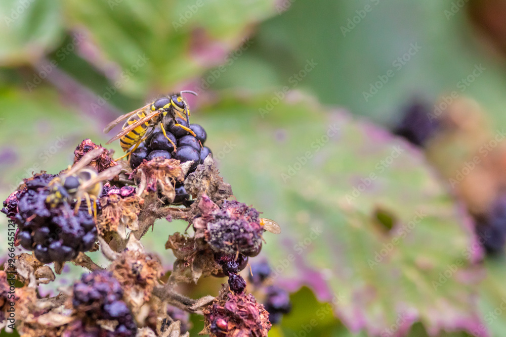 Wasp eating a wild raspberry on a close up view. An amazing background of Chilean wild life at Patagonia, South of Chile, where an amazing nature can be found. The wasp keeps on feeding during autumn