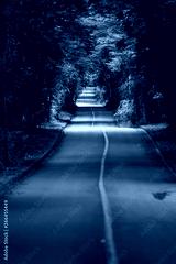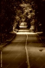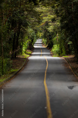 An amazing fantasy landscape inside Patagonia forest, a road going deep inside the forest creating an amazing tree tunnel on an awe natural scenery at sunlight. A nice perspective on an infinity road