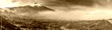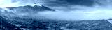 Amazing panoramic view of Osorno Volcano volcanic cone summit. Awe volcanic scenery on a remote location on a misty day with a moody atmosphere just an amazing Patagonia scenic landscape