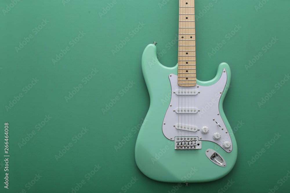 緑色の背景に置いたパステル緑色のエレキギターストラトキャスター