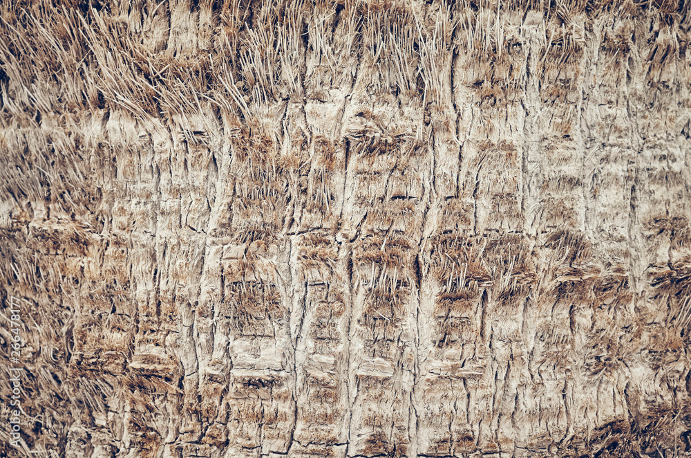 Palm tree trunk close up picture, natural background or texture, color toning applied, selective focus.