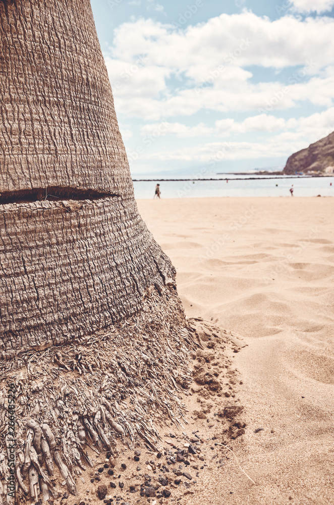 Palm tree trunk on a beach, selective focus, color toned picture, Tenerife, Spain.