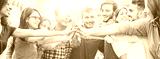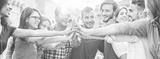 Young happy people stacking hands outdoor - Diverse culture students celebrating together - Youth lifestyle, university, relationship, human resorces, work and friendship concept - Focus on hands