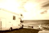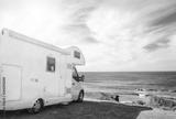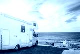 White travel caravan car stay on the beautifull ocean coastline