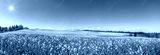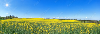 Panorama von einem blühenden, nach rechts leicht abfallenden Rapsfeld im Frühling im Sonnenschein