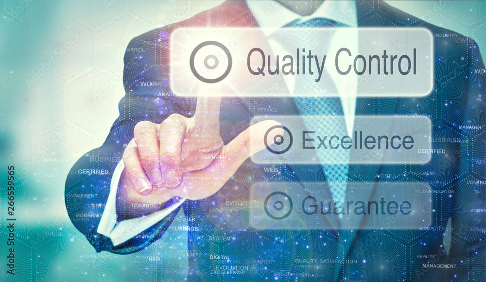 A business man selection a Quality Control button on a futuristic display with a concept written on it.