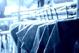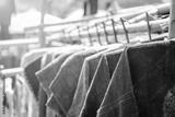 Blue cotton shirt haning on the bamboo rail, outday day light, shopping and fashion concept, Thai style blue cotton shirt
