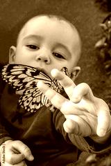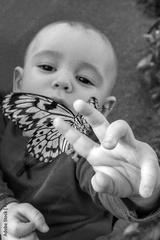 Little boy playing with exotic butterfly. Detail.