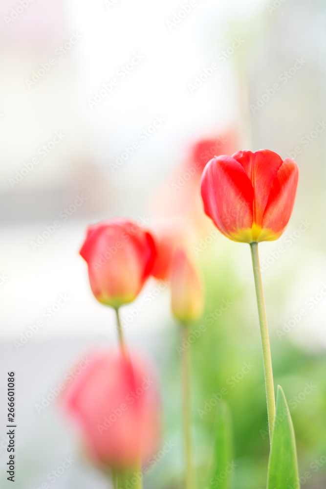 Beautiful red tulips. Copy space. Concept background, flowers and nature.
