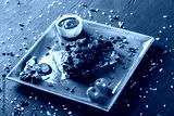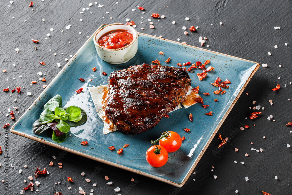 Grilled meat steak and tomato sauce in plate on dark stone background. Hot Meat Dishes