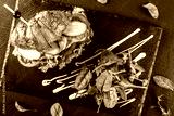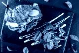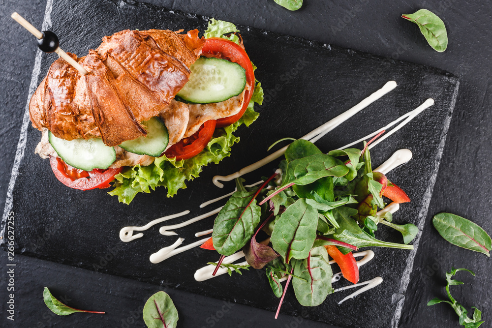 Croissant sandwich with fillet grilled chicken, fresh vegetables, cheese and greens on black shale board over black background