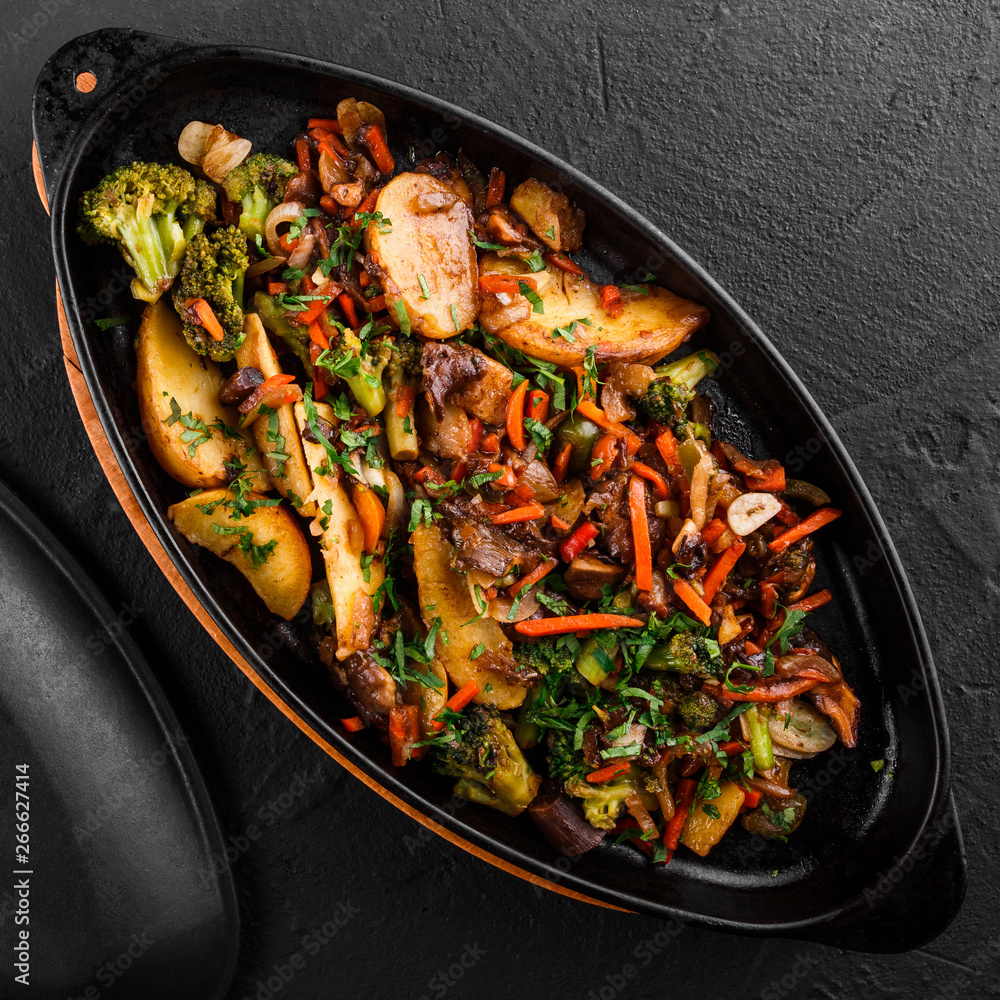 Baked vegetables, greens, potatoes, broccoli in pan on black stone background. Clean eating, healthy vegan food concept