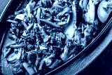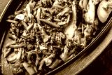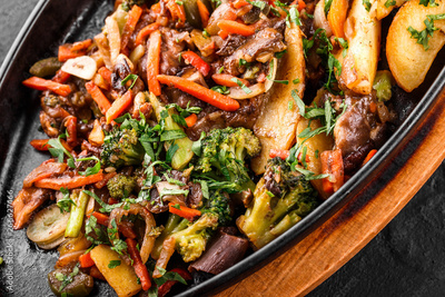 Baked vegetables, greens, potatoes, broccoli in pan on black stone background. Clean eating, healthy vegan food concept