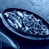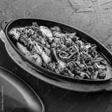 Baked vegetables, greens, potatoes, broccoli in pan on black stone background. Clean eating, healthy vegan food concept.