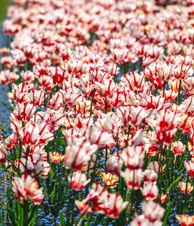 Colorful tulip field, purple flower tulip in spring background, selective focus, closeup