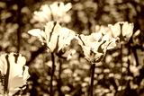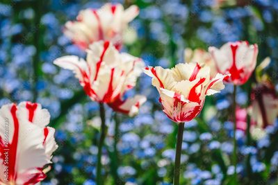 Colorful tulip field, purple flower tulip in spring background, selective focus, closeup
