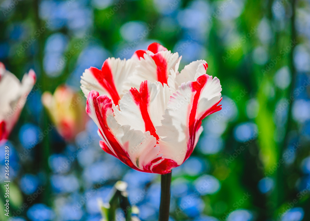 Colorful tulip field, purple flower tulip in spring background, selective focus, closeup