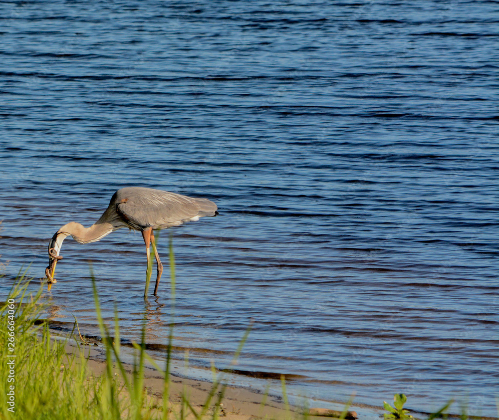 Great Blue Heron killing and eating a Boa snake. At Okeechobee lake, Okeechobee County, Okeechobee Florida, USA