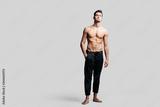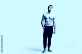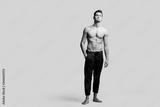 Dark-haired handsome young dancer with bare torso wearing a black sports pants is standing with his hand in his pockets on a white background