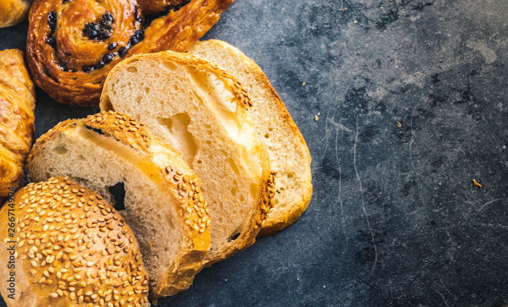 Fresh fragrant breads on the table Top view.Food concept background, Bread with wheat flour and egg .Flat-lay Design cover or background concept