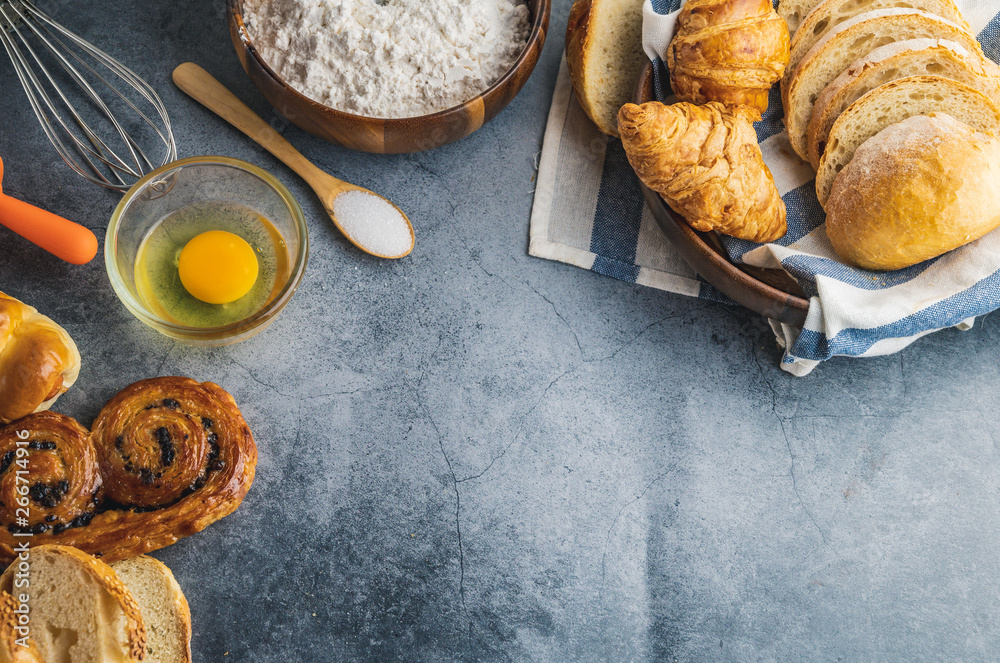 Fresh fragrant breads on the table Top view.Food concept background, Bread with wheat flour and egg .Flat-lay Design cover or background concept
