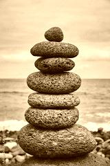 Color toned picture of a stone stack on a beach, balance and harmony concept, selective focus.