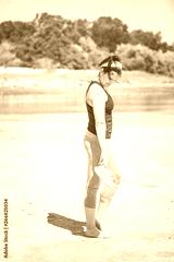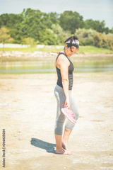 Young woman running on the beach. Concept woman workout wellness fitness jog . Toned Image.