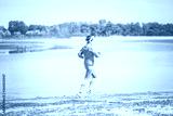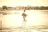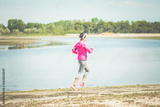 Young woman running on the beach. Concept woman workout wellness fitness jog . Toned Image.