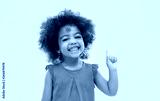 idea, warning and childhood concept - happy little african american girl pointing finger up over grey background