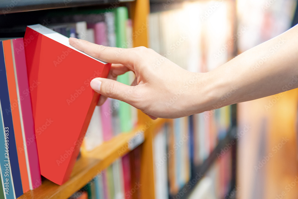 Bestseller publishing concept. Male hand choosing and picking red book from wooden bookshelf in bookstore. Education research in university public library.